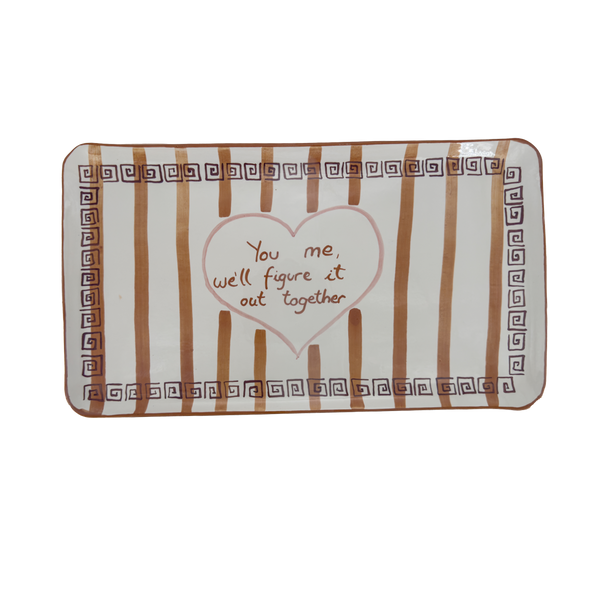 Spruce up your kitchen with the Honey Serving Platter - Striped. This charming platter boasts a heart design with the sweet message "You and I will conquer anything." Ideal for entertaining or adding a touch of everyday sophistication.