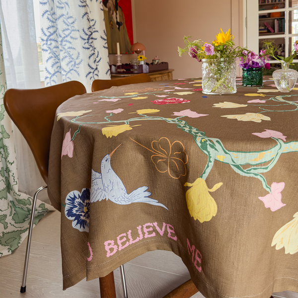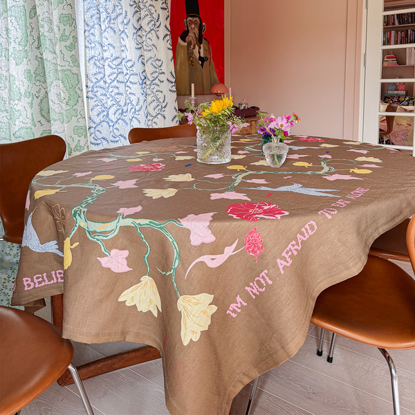Add a touch of flair to your dining table with this visually striking tablecloth, inspired by a lively garden. The delicate writing along the edge, which reads, "I know what I bring to the table, so believe me, I'm not afraid to eat alone", makes this a must-have for those who bring more than just good conversation to the table.